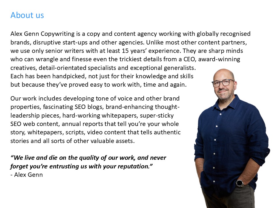 At Alex Genn Copywriting, we've been helping financial services businesses make their words work hard for over 20 years. Talk to us today to discuss how we can help you meet your objectives.
